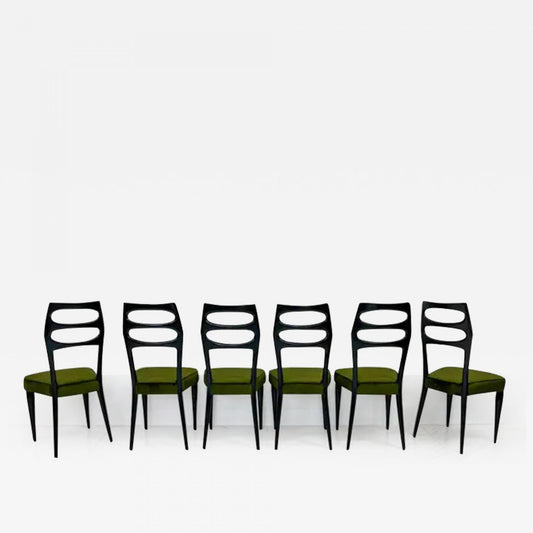 Paolo Buffa Six Sculptural Dining Chairs, Olive Green Velvet, 1950s