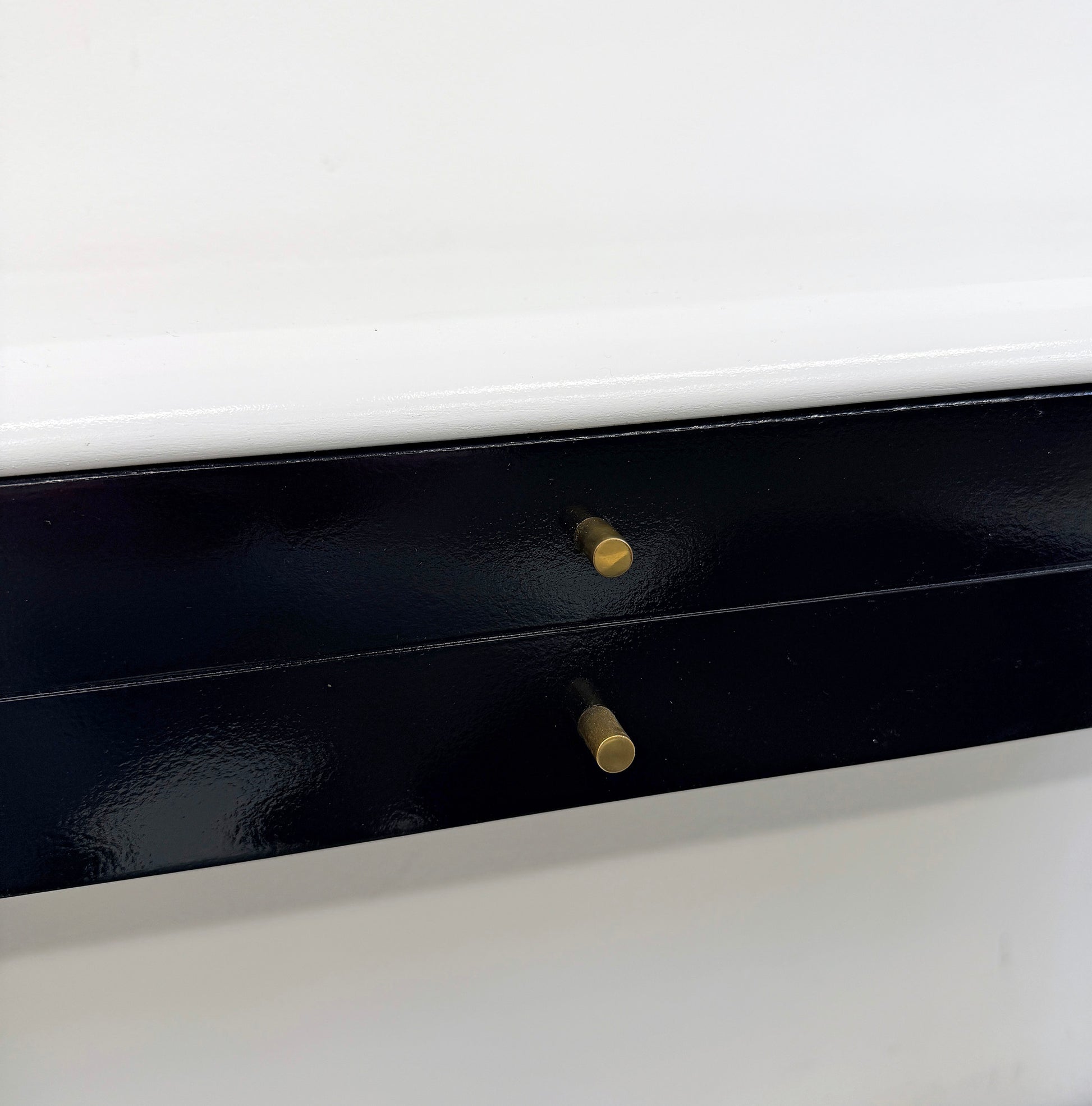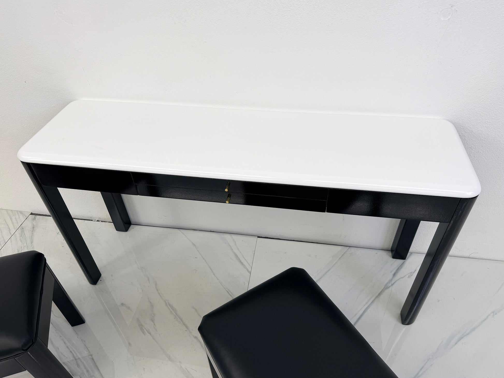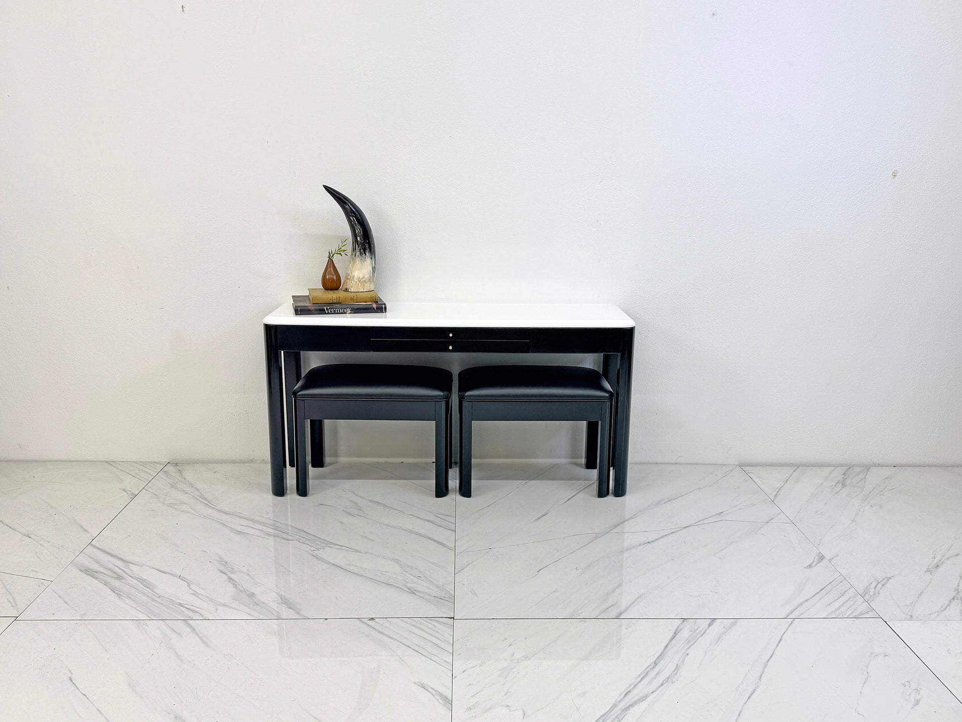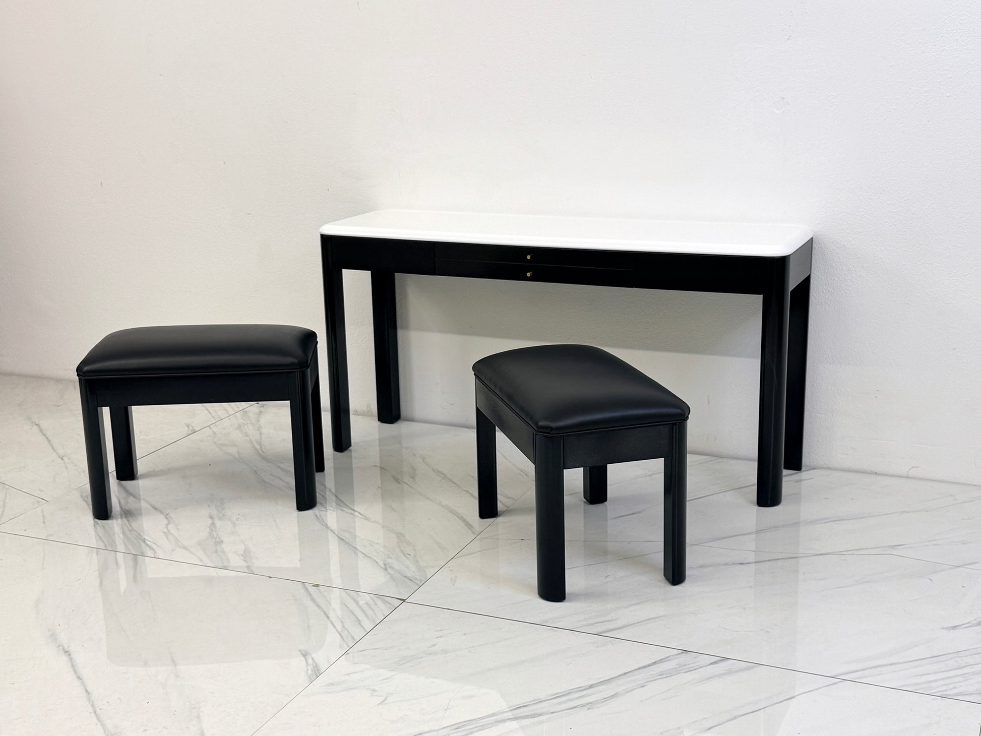 The glossy white top brings a fresh, almost lacquered brightness that plays beautifully against the deep black Italian leather upholstery of the benches—smooth, tailored, and unmistakably luxe. The benches tuck seamlessly beneath the console, keeping the footprint clean while offering that perfect, considered functionality. It’s giving André Arbus energy-- elegant, practical, and beautifully resolved.