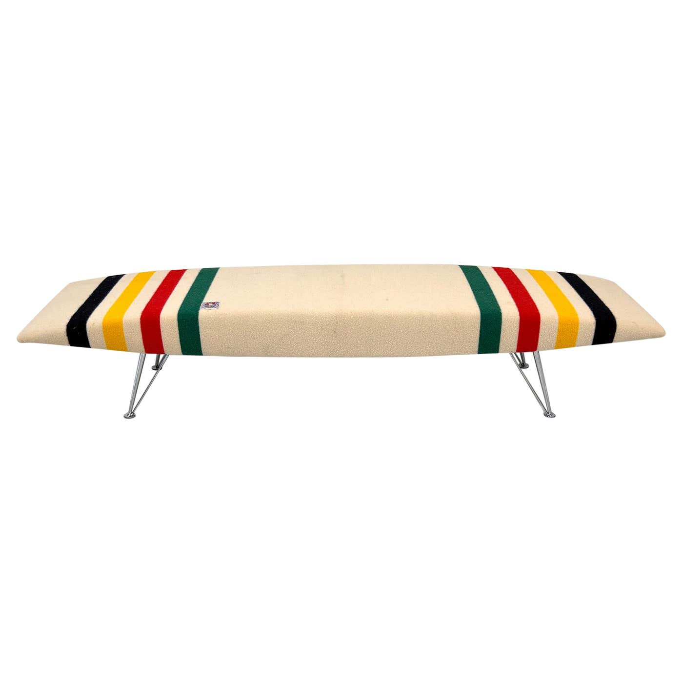This is a Plana bench, designed by the wildly imaginative Massimo Iosa Ghini for Moroso — but she’s got a twist. Instead of the usual upholstery, she’s wrapped in a genuine, well-worn Pendleton Glacier National Park blanket dating back to the 1930s. That’s right — this textile predates WWII, and it’s lived a whole life before being lovingly reimagined as couture for this bench. The bold stripes — black, yellow, red, and green — were originally designed to honor Glacier National Park and debuted in 1916, the same year the National Park Service was founded. It’s a woven love letter to American wilderness, and this vintage blanket wears its age like a badge of honor: soft patina, visible history, and all the charming marks of a long, full life. We even had the original Pendleton tag hand-stitched right onto the top, for provenance.