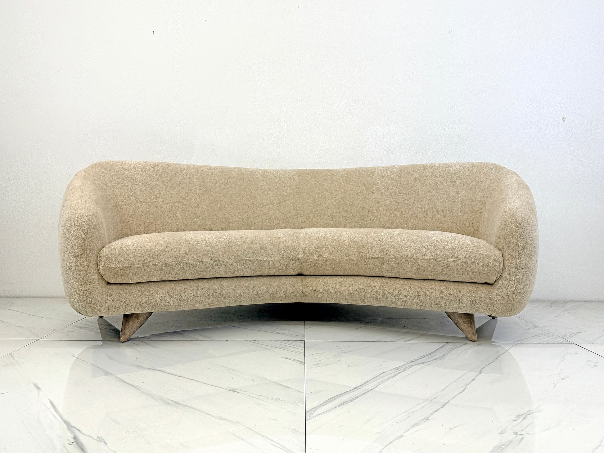 This piece doesn’t “have a curve.” It is the curve. One long, sweeping, unapologetic gesture—as if someone took a ribbon of silk, whispered something scandalous to it, and it decided to become furniture. It glides. It lounges. It absolutely refuses to be pushed up against a wall like some kind of architectural afterthought.